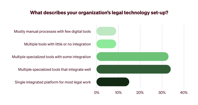 The respondents work in law firms, government agencies, and corporate legal teams. They were distributed across a variety of roles, from partner to paralegal, and operate in a broad variety of legal practice areas. Results were not weighted.