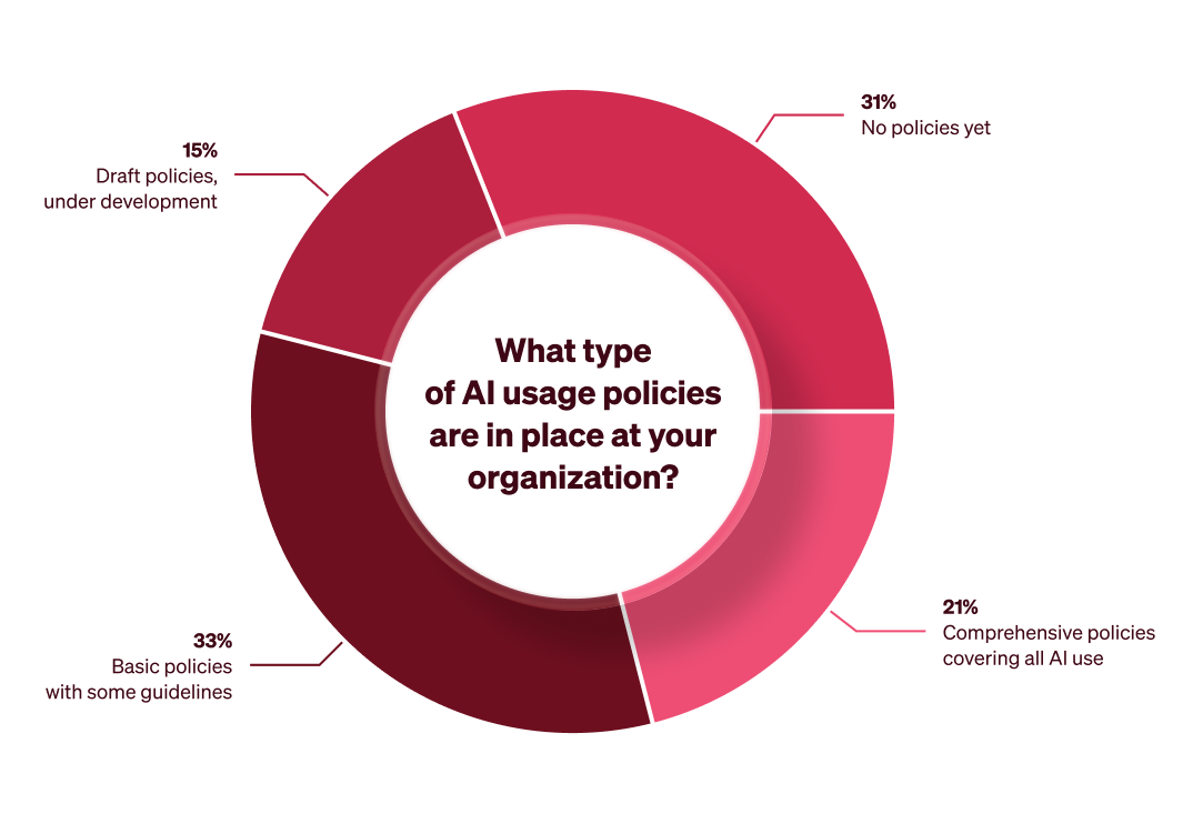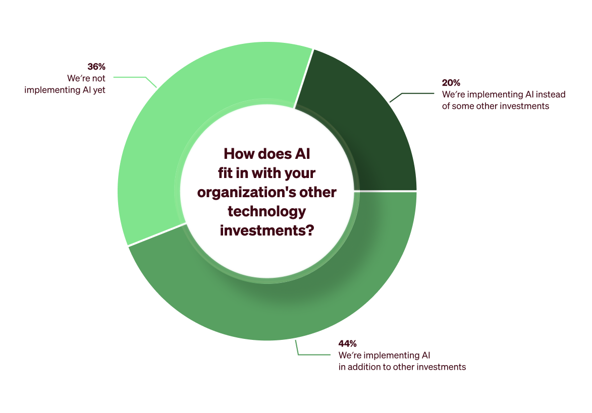 Organizations also show an increased willingness to invest in AI. 64% of respondents report that their organizations are investing in AI tools.