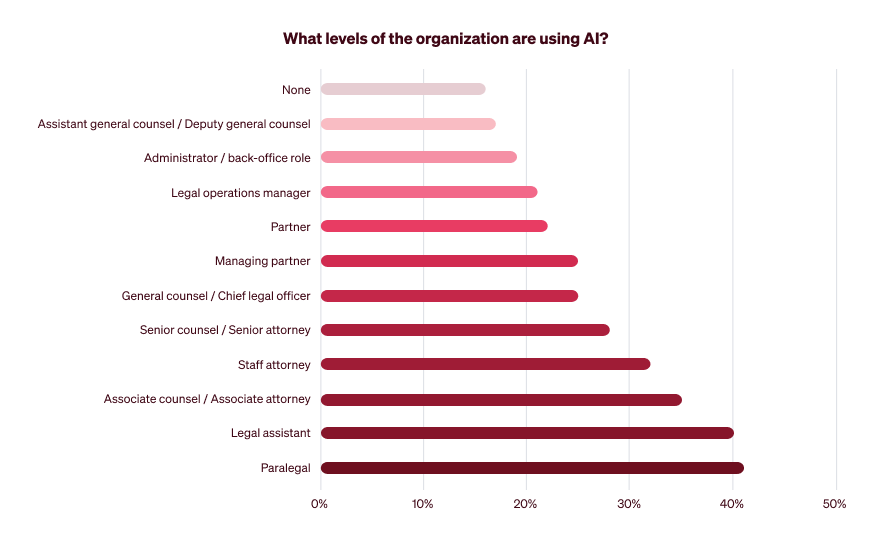 AI usage spans nearly every level of the legal organization, from managing partner to paralegal. But the highest current usage appears to be among staff and junior attorneys.