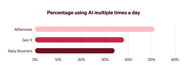 Younger legal professionals are integrating AI more deeply into daily work. Only about a third of Baby Boomers rely on AI throughout the day, compared to over half of Millennials.