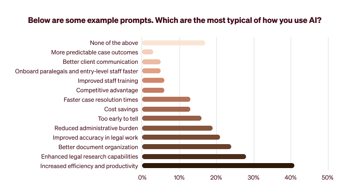 AI adoption is strongest where legal work is text-heavy and time-intensive. Our survey shows the top uses cases for AI in law are: